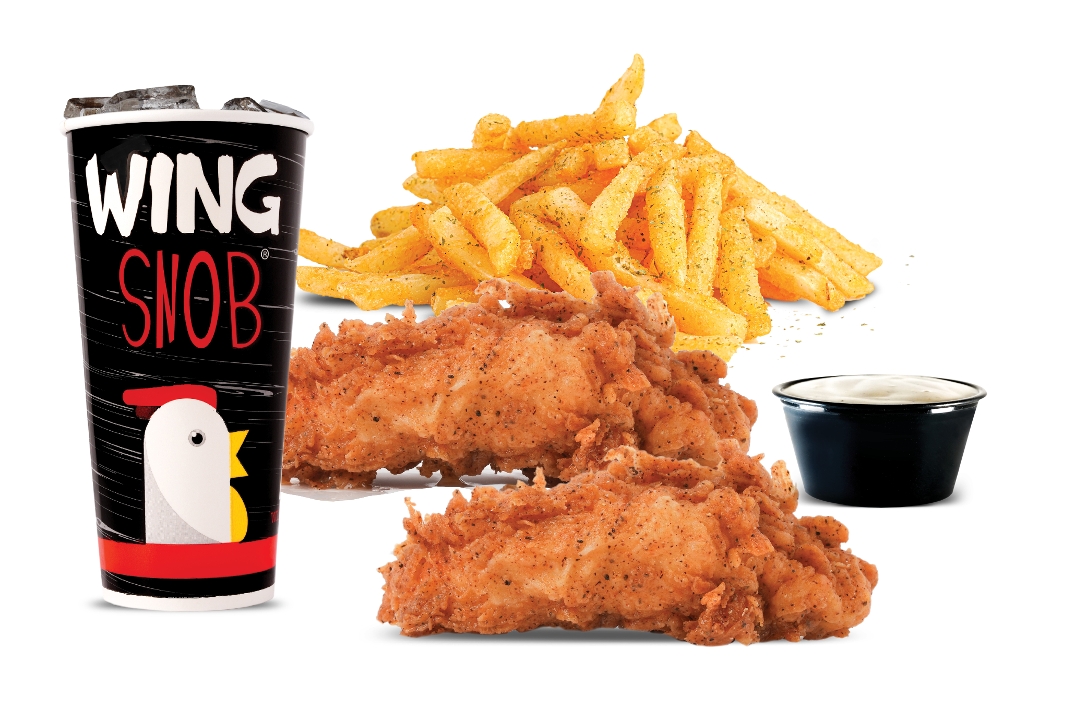 2 crispy chicken tenders, also includes your choice of a dipping sauce plus a side and a drink!