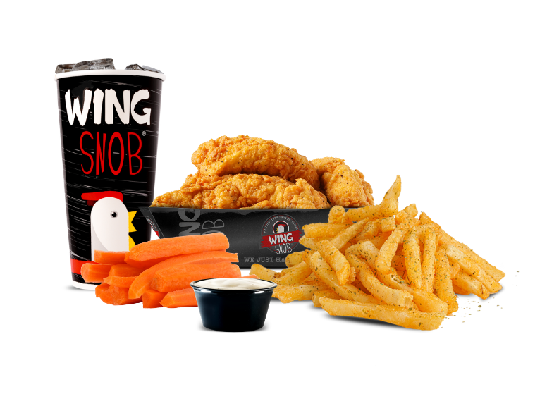 5 crispy chicken tenders, also includes your choice of a dipping sauce plus a side & a drink!