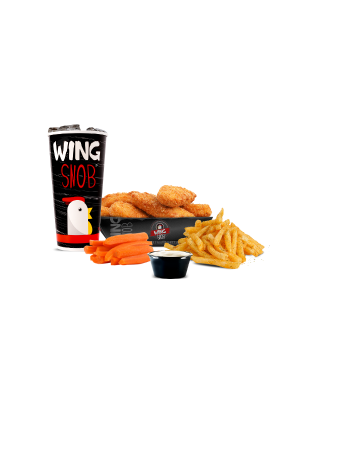 Includes 6 boneless wings plus a side with a fountain drink.
