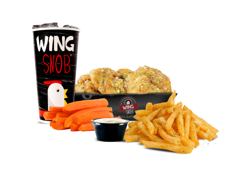 Includes 6 wings (3 boneless/3 traditional) plus seasoned fries, veggies OR 4oz coleslaw & a fountain drink.