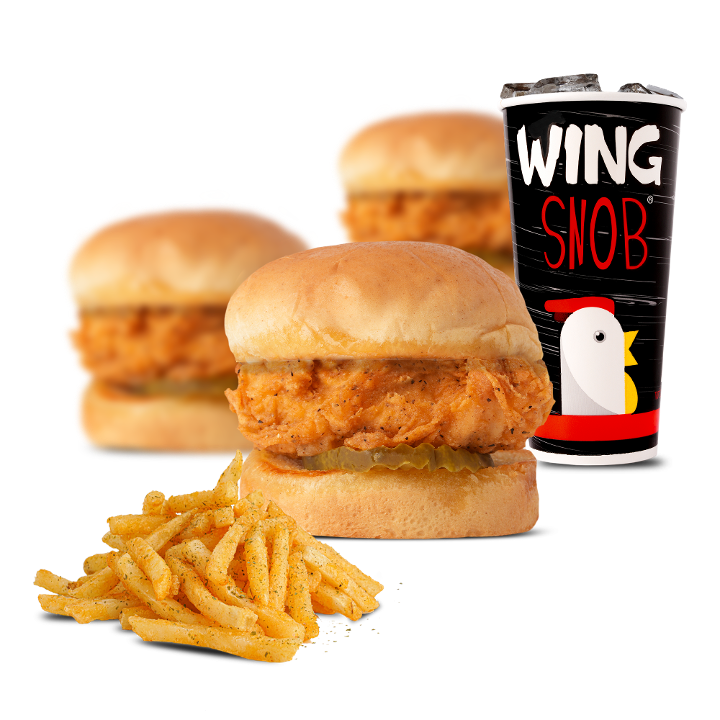 3 pack of chicken sliders, 1 flavor and includes a side & a fountain drink.