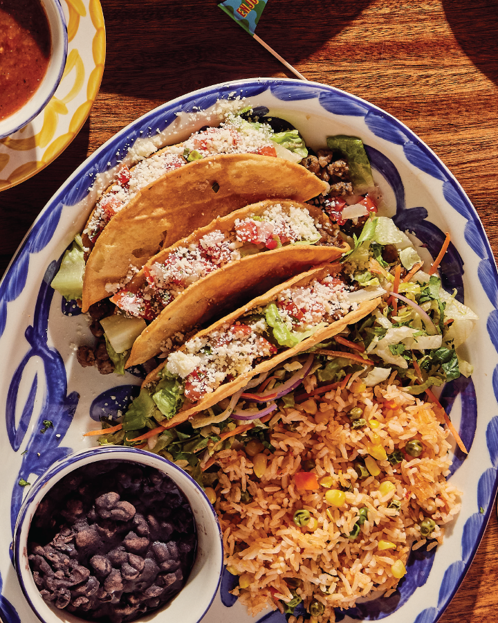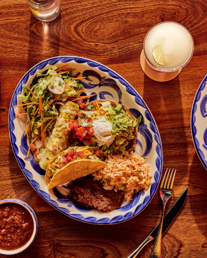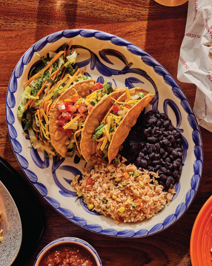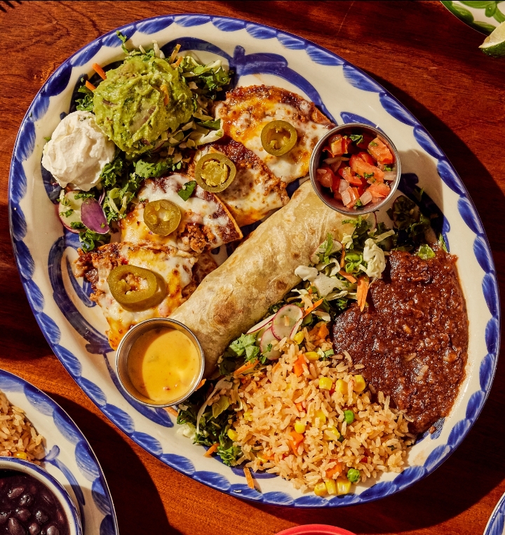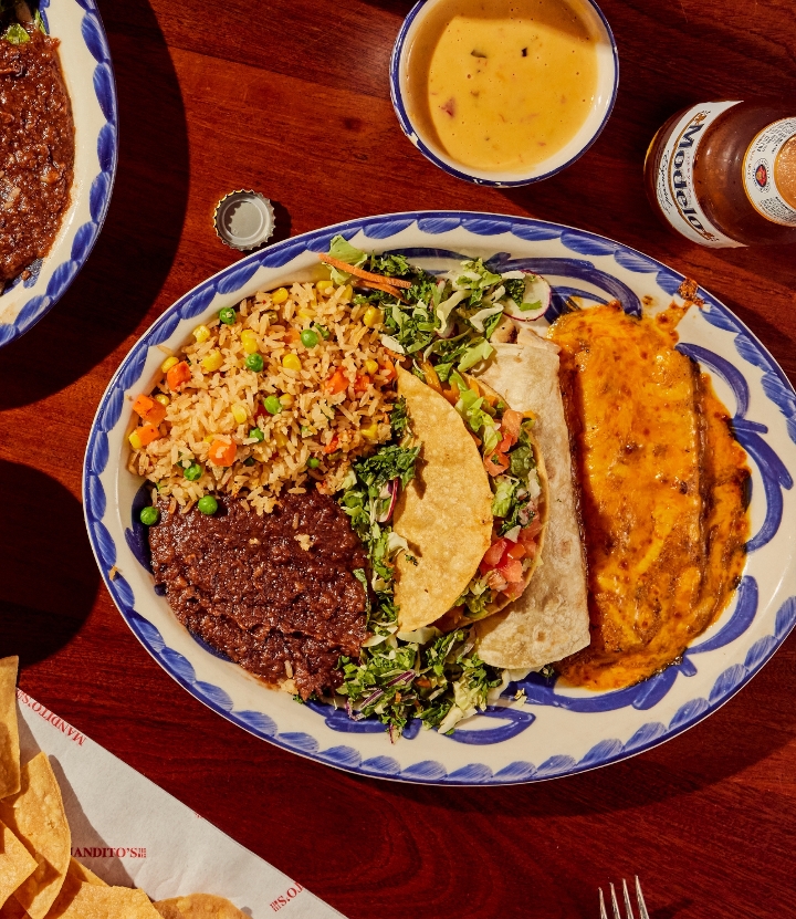 One cheese enchilada, one crispy ground beef taco, one soft chicken fajita taco served with Mexican rice and your choice of refried beans, vegan black beans, or Charro beans.
