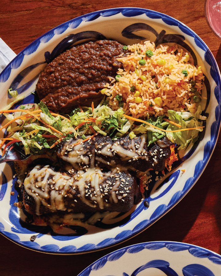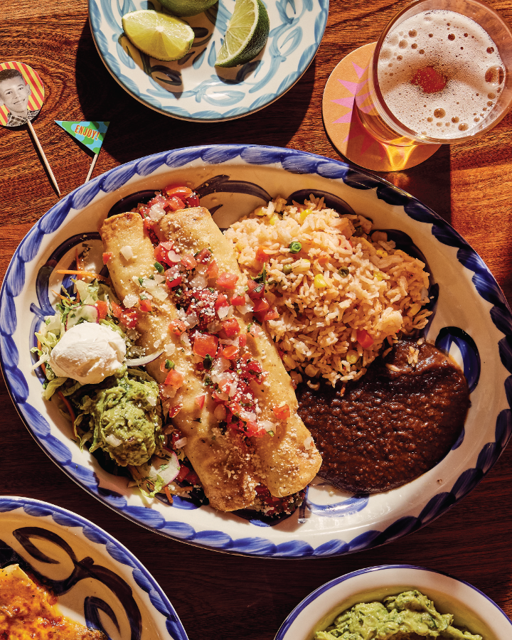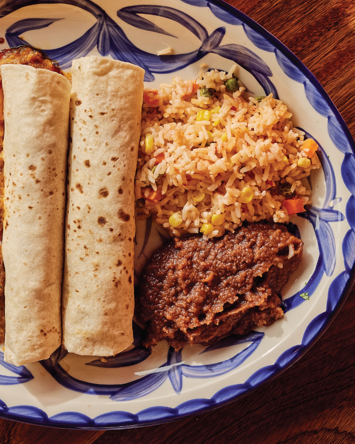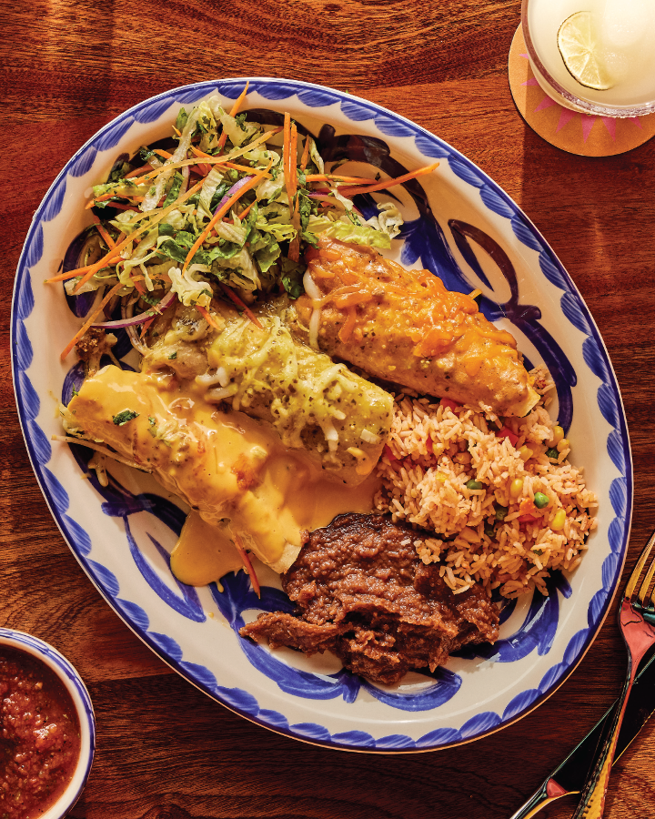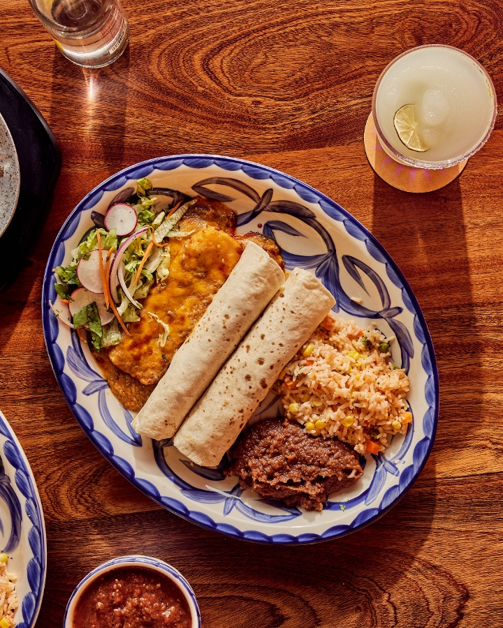 One cheese enchilada, one crispy ground beef taco, one soft chicken fajita taco served with Mexican rice and your choice of refried beans, vegan black beans, or Charro beans.