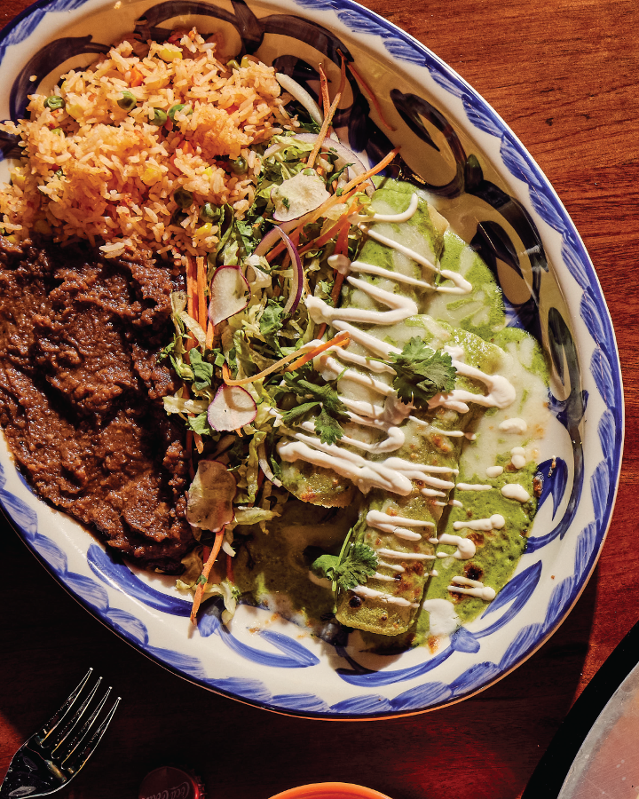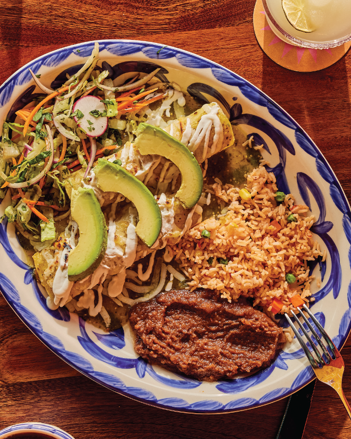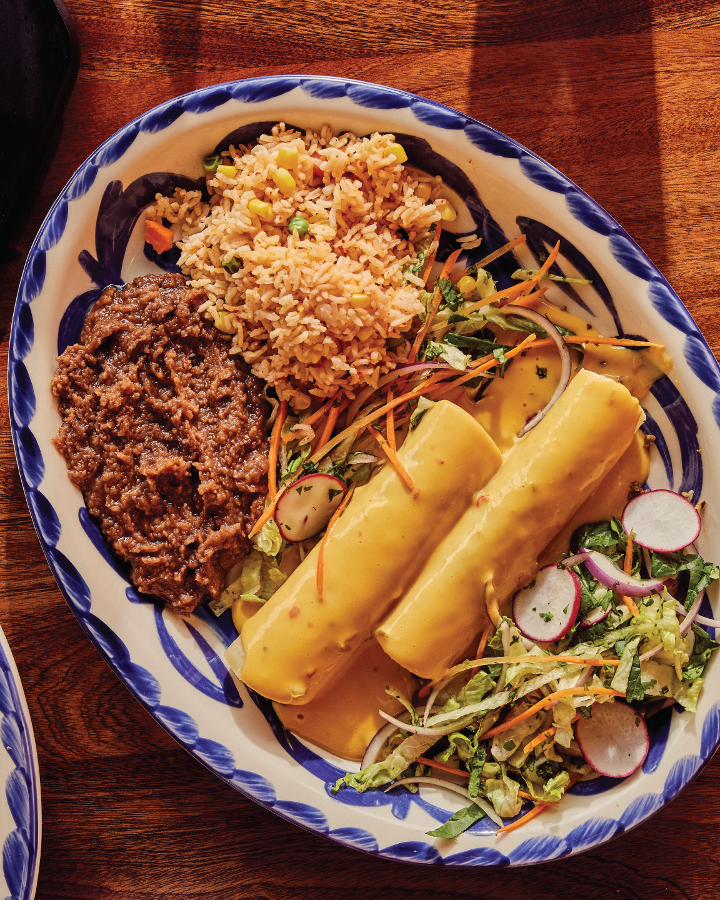 One cheese enchilada topped with chili gravy and two soft tacos with chicken fajita with chili con queso and pico de gallo served with Mexican rice and your choice of refried beans, vegan black beans or charro beans.