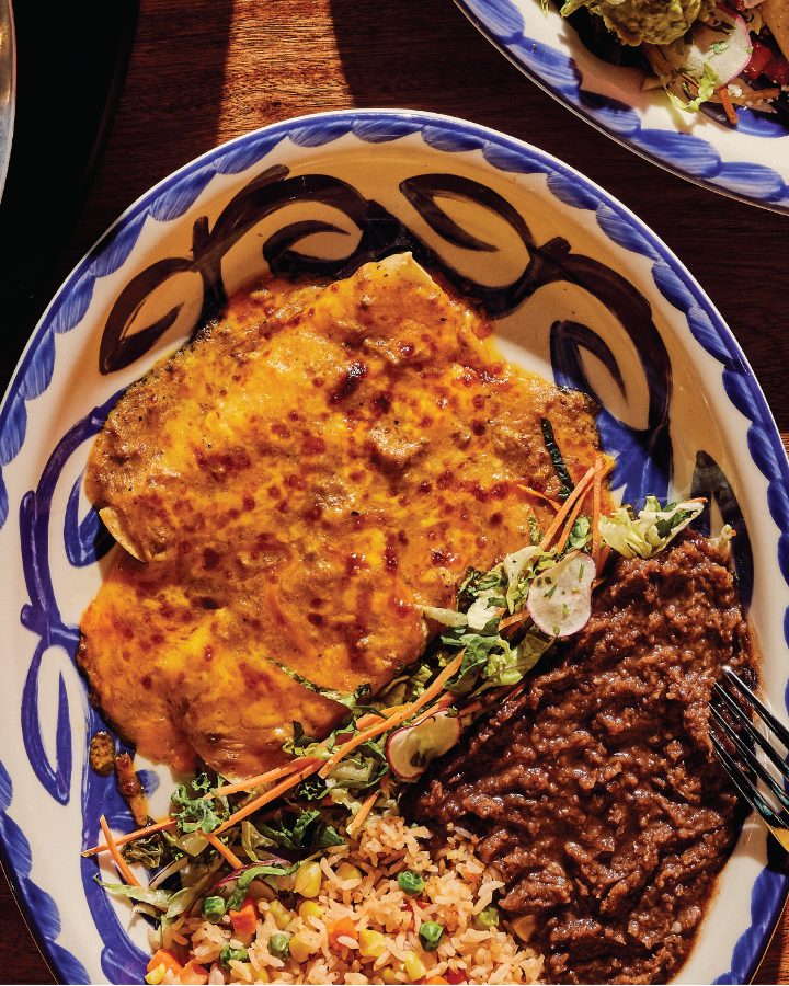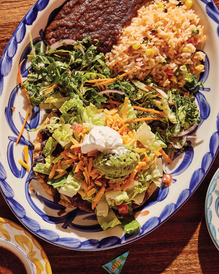 One ground beef tostada, one crispy ground beef taco and one chicken enchilada topped with salsa ranchera, served with pico de gallo and guacamole served with Mexican rice and your choice of refried beans, vegan black beans, or charro beans