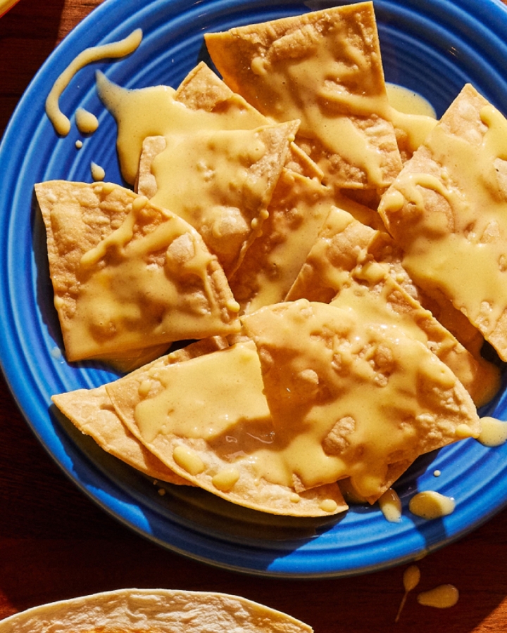 Stacked chips covered in melted cheese and toppings in a kid’s portion