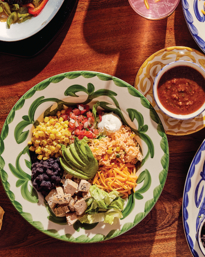 Lettuce, corn, pico de gallo, shredded cheese, avocado, white rice, black beans and your choice of meat, topped with sour cream and tortilla strips
