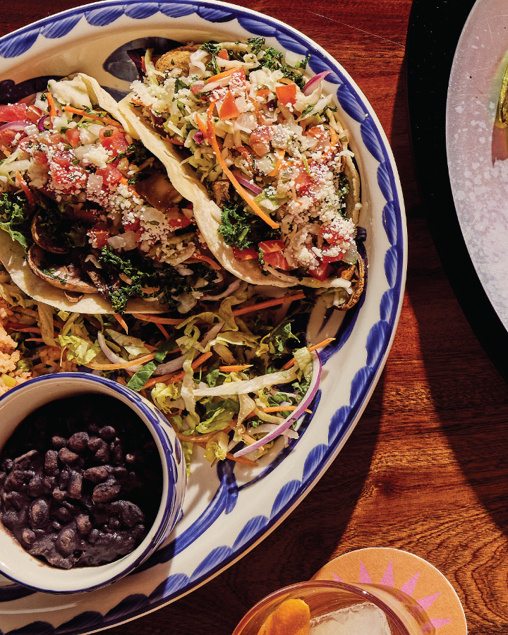 Four ground beef nachos and one steak fajita taco al carbon served with Mexican rice and your choice of refried beans, vegan black beans, or Charro beans.