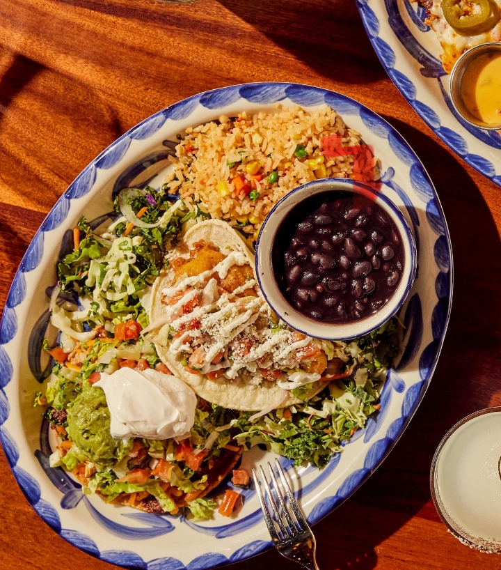 one bean and cheese tostada and one baja taco, served with choice of refried beans, vegan black beans, or charro beans and Mexican rice
