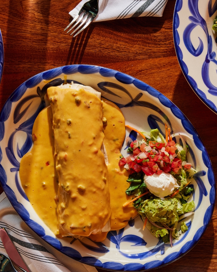 Large flour tortilla filled with your choice of meat, Mexican rice, twice refried beans and cheese, topped with chili con queso and pico de gallo