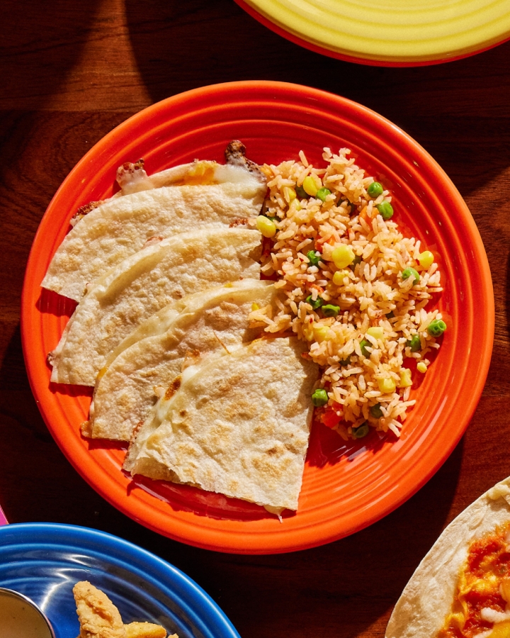 Flour tortilla with mozzarella and cheddar cheese, served with mexican rice