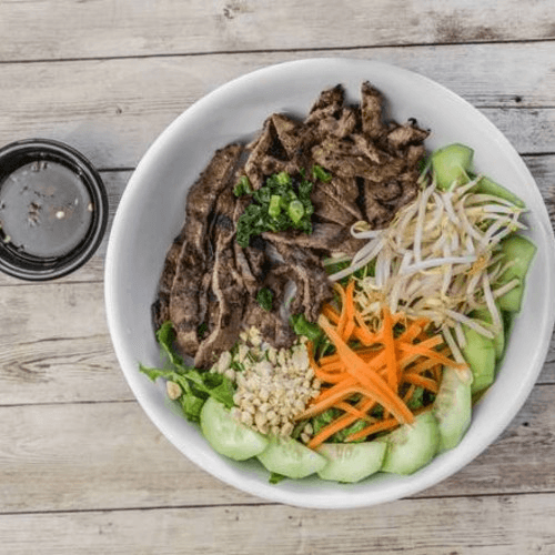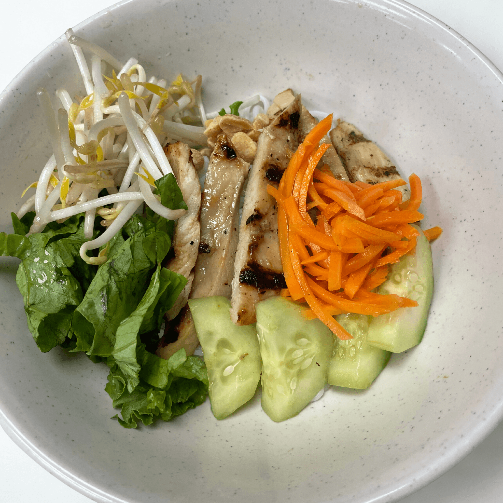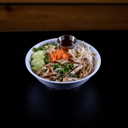 Grilled lemon grass Chicken with Warm Vermicelli noodle topped with fresh cucumber, beansprouts, lettuce, scallions and peanuts. Served with fish sauce on side.