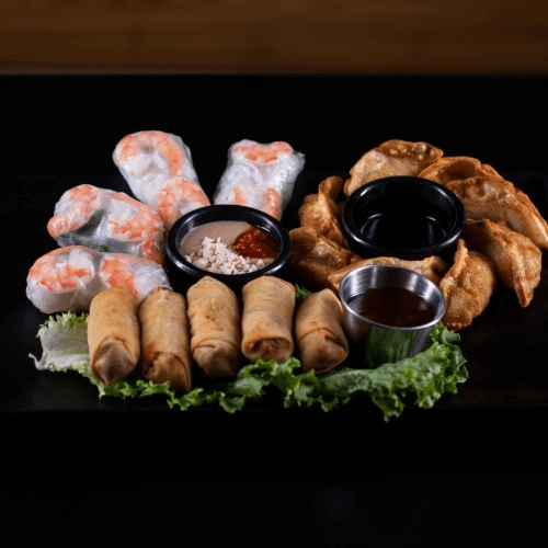 Platter comes with 5 pork egg rolls & fish sauce, 8 pork fried dumplings & dumpling sauce, and 2 shrimp spring rolls & peanut sauce