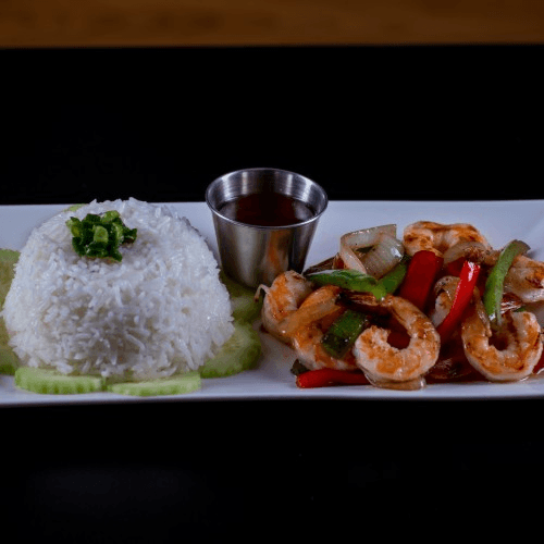 Wok fried filet shrimp cooked with bell peppers and garlic, side of steamed rice and fresh cucumbers and fish sauce on the side.