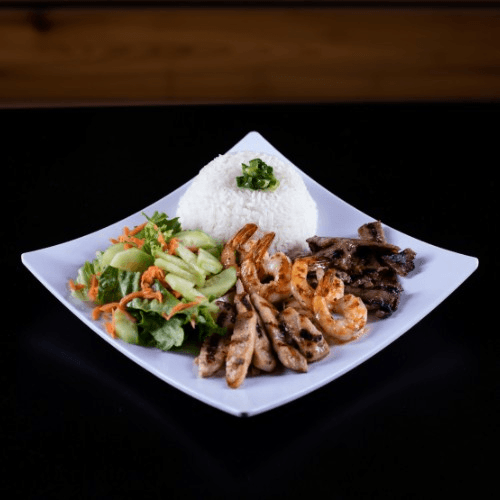 R6: Steamed Rice with scallions, Grilled Chicken, Grilled Pork and Grilled Shrimp and salad with side of Asian Vinegarette dressing and a side of fish sauce.