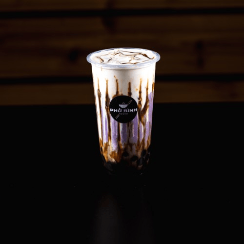 This milk tea has layers of brown sugar, taro milk tea, and topped with cream cheese mousse and includes tapioca for best taste.