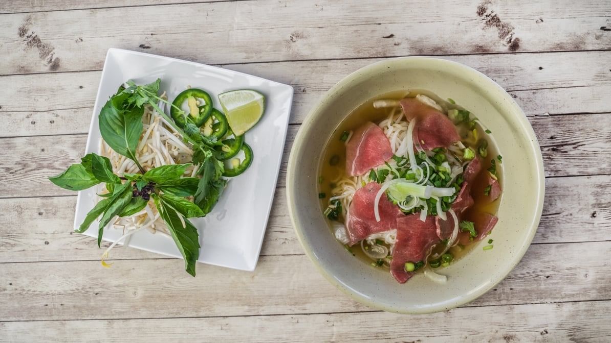 Round eye steak and brisket with rice noodle, our famous all natual bone broth and topped with white onion, green onion, and cilantro . Includes side of basil, beansprouts, lime, jalepeno, and cilantro